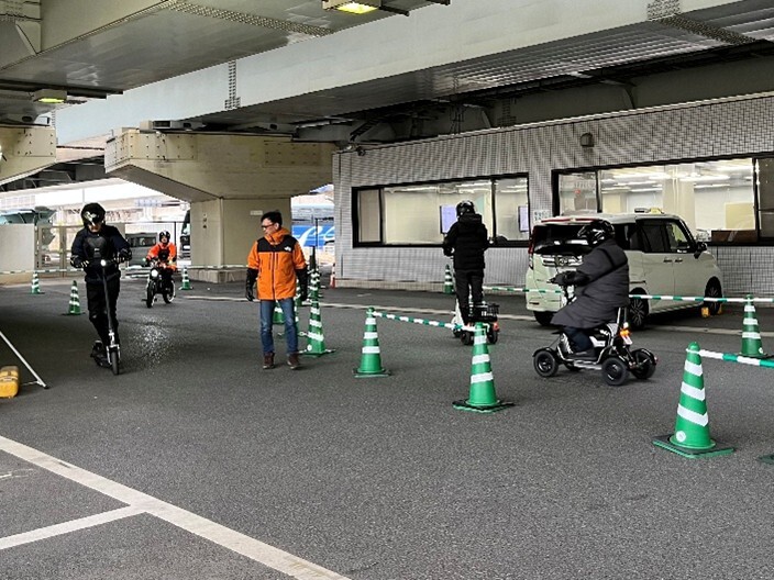 駐車場にスラロームや段差などの障害物を設けた特設コースにて、実機を用いた走行訓練を実施しました。